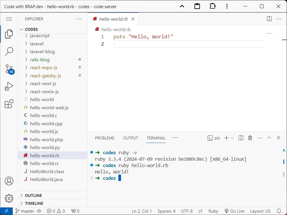The Pro Linux Container of Brap is pre-configured with Ruby.